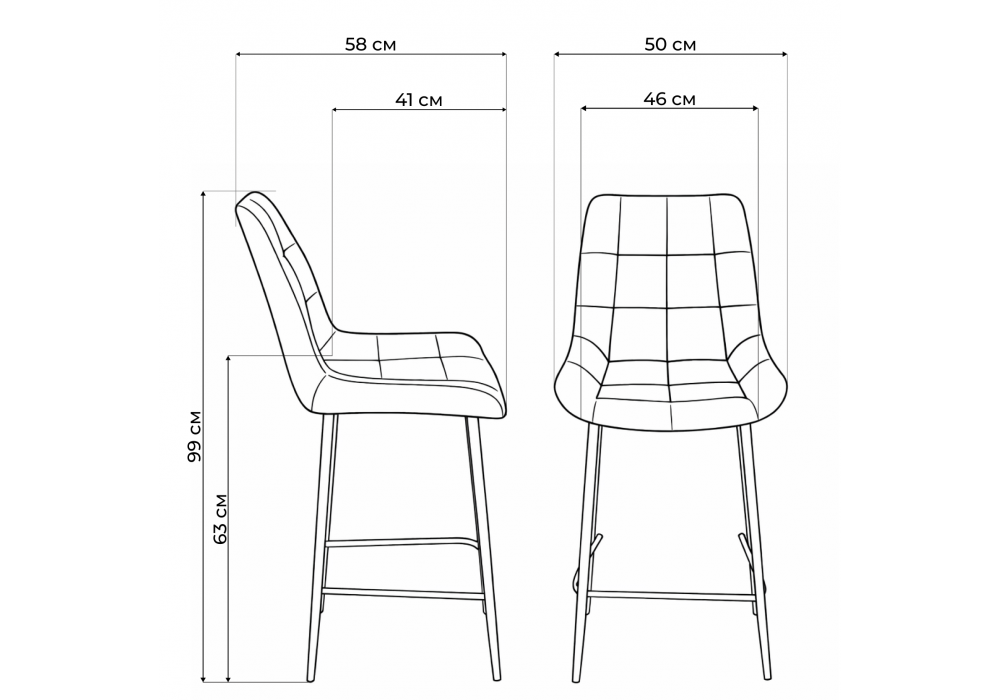 Материал каркаса - металл; Материал сиденья - велюр; Материал обивки - велюр; Цвет ножек - серый; Ширина - 50; Глубина - 58; Высота - 99; Ширина сиденья - 46; Глубина сиденья - 41; Высота сиденья - 63;