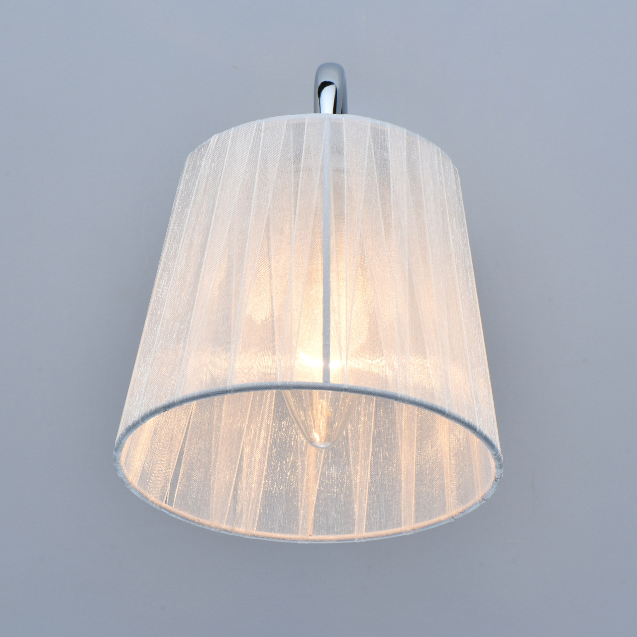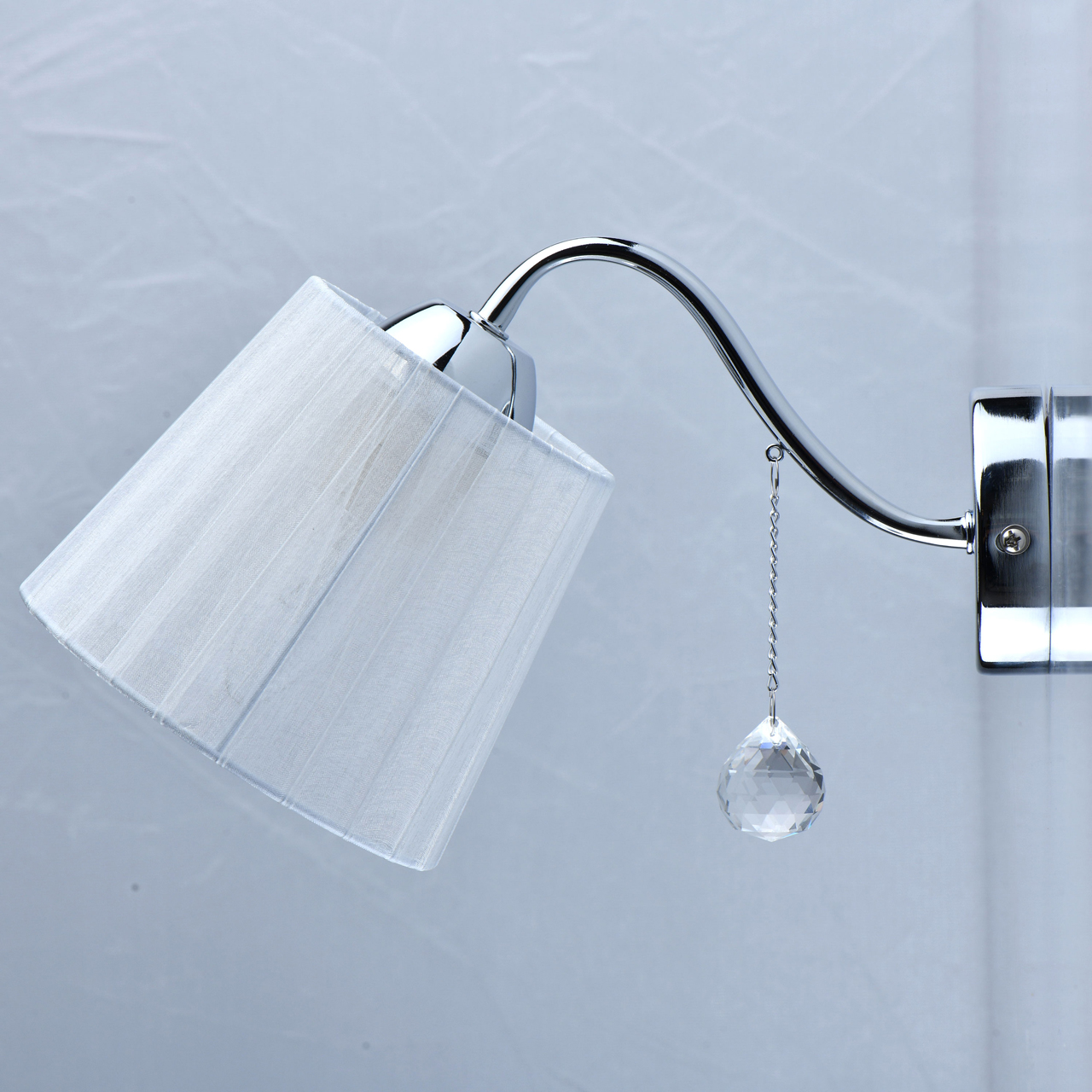 Основание бра выполнено из сплава металла и гальванизировано в цвет хрома. Абажур из прозрачной органзы белого цвета с термостойким акрилом внутри. Абажур отделан кантом сверху и снизу, прошит. Декор бра - металлическая цепочка цвета основания и прозрачный хрусталь в форме шара.