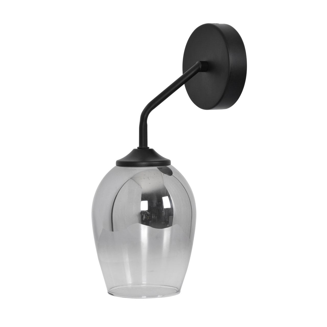 Металлическое основание настенного бра окрашено в черный цвет. Стеклянный плафон выдувается в форму и гальванизирован в дымчатый цвет по принципу градиента - от основания плафона к краю цвет сходит на нет.