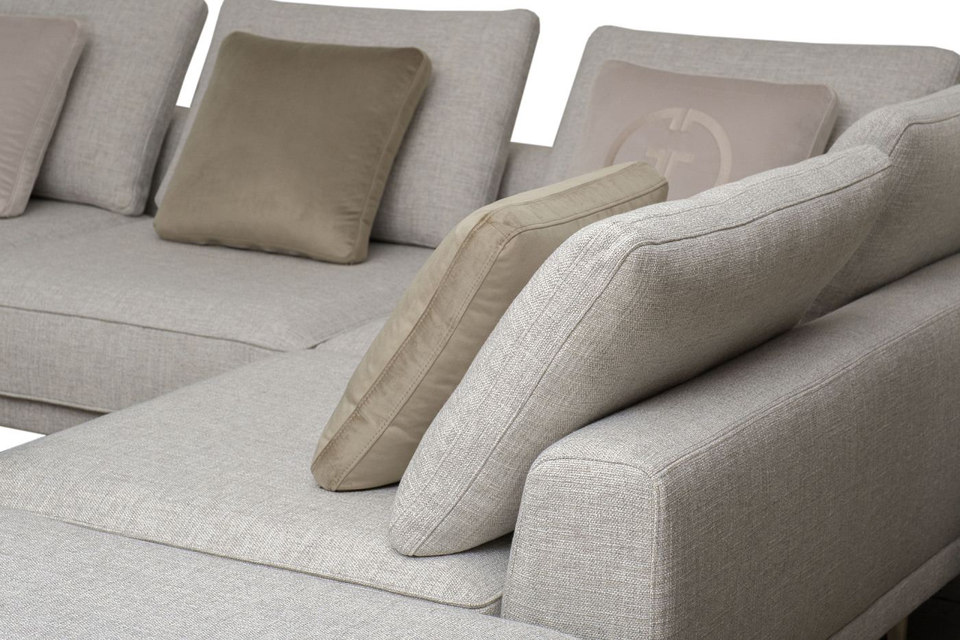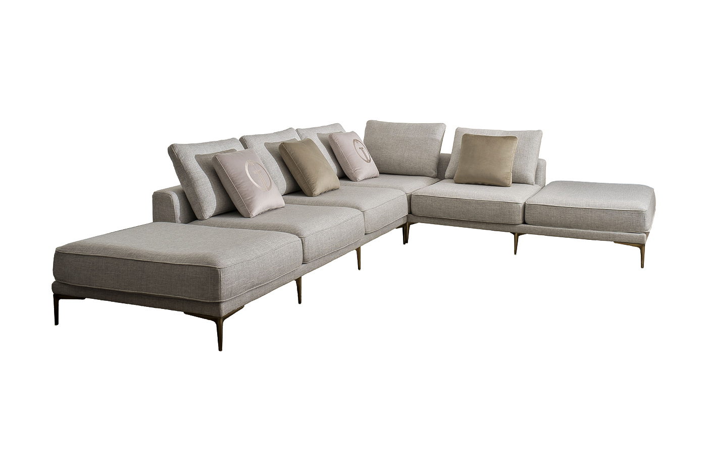 модуль угловой левый DL+P- 1шт; модуль прямой DO+P- 1шт.Комплект выполнен в ткани из коллекции Garda Decor- рогожка Norton-SER. В состав комплекта входят декоративные подушки: декоративная подушка с бурлетом 50*50см-2шт в ткани из коллекции Garda Decor- велюр Colt030 с вышивкой эмблема в цвет ткани, декоративная подушка с бурлетом 50*50см-2шт в ткани из коллекции Garda Decor- велюр Colt1002. Опоры металл- цвет бронза.Габариты комплекта: Габариты модульного дивана: