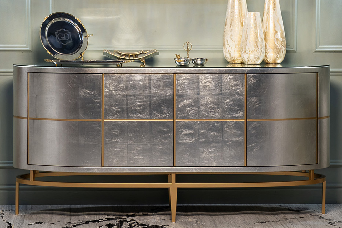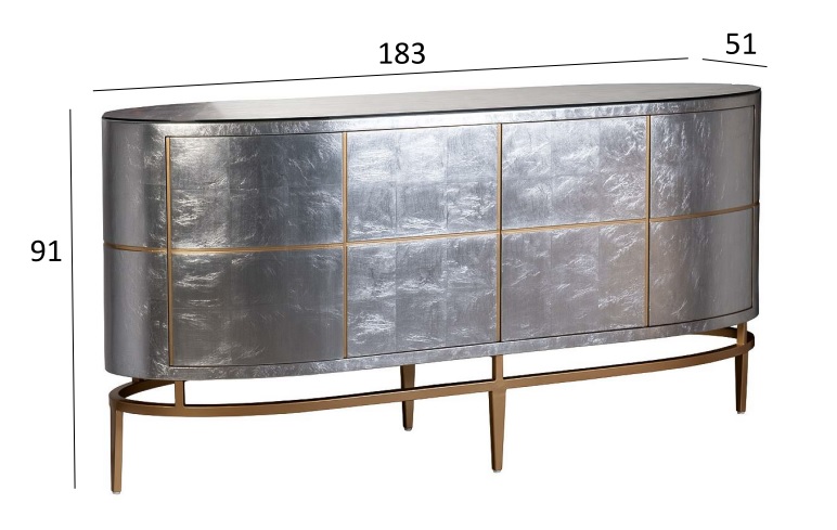 Футуристичный дизайнерский комод потрясает чистотой линий и минималистичностью форм. В начале ХХ века для произведений живописи и архитектуры в стиле футуризма были характерны длинные динамические линии и чистые геометрические формы, предполагающие новый уклад жизни, движение и обновление. Вертикальные и горизонтальные вставки золотисто-медного цвета, овальная опора с ножками, перекликающаяся с формой комода, делают его удивительно современным, при этом создавая вполне ощутимую иллюзию стиля 10-х годов прошлого века. Корпус комода покрыт тончайшими листьями серебристой фольги и покрыт сверху лаком по авторской технологии. Четыре распашные дверцы с механизмом push-to-open открывают доступ в два боковых и одно центральное отделение с полкой. В комплект входит дополнительная стеклянная столешница, защищающая поверхность от царапин. Комод прокрашен и залакирован со всех сторон, чтобы устанавливать его в любом месте помещения. Дополните комод кофейным или журнальным столиками арт. ART-2705-ET, арт. ART-2705-C