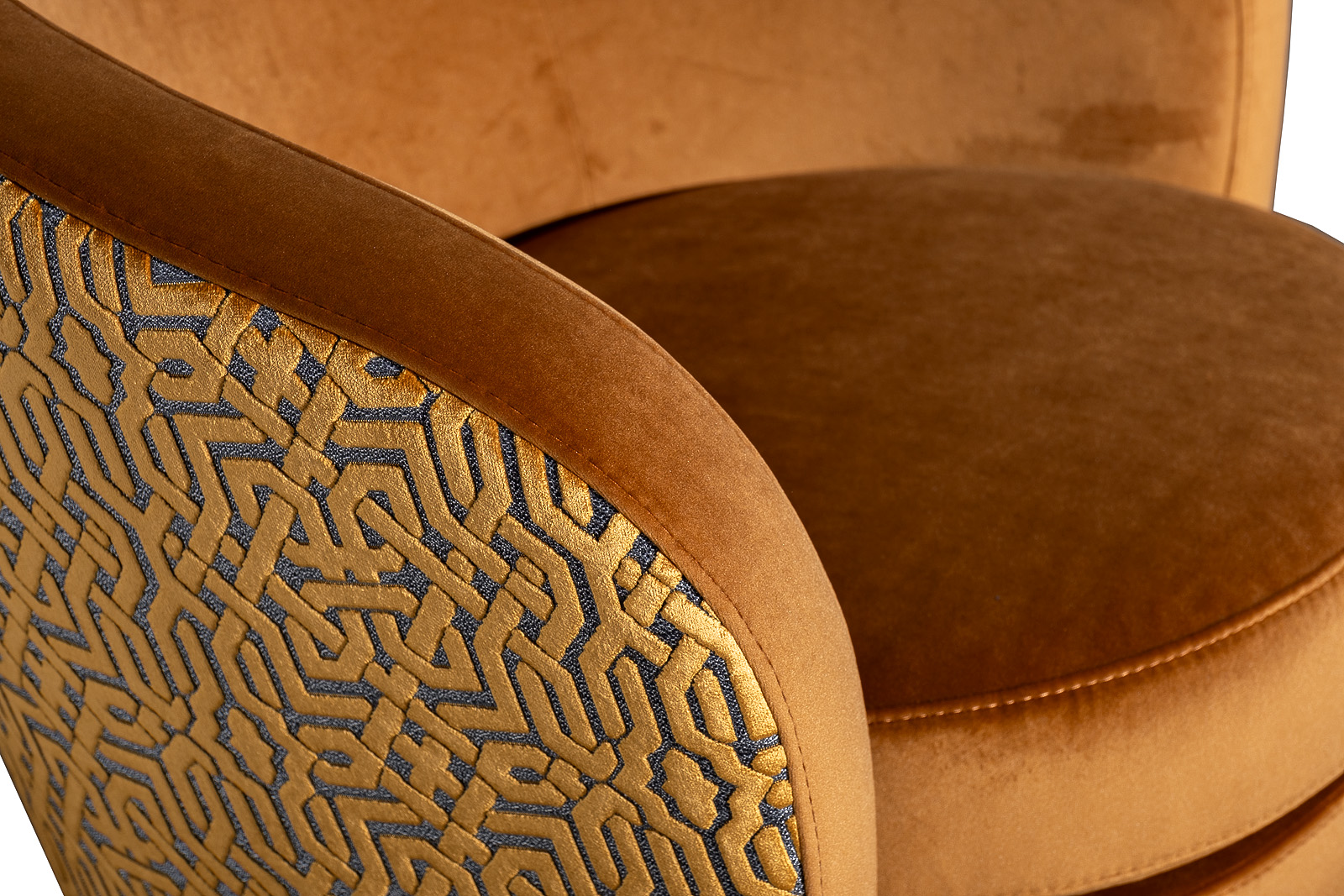 В стандартном исполнении: обивка в ткани велюр Паддингтон(Paddington)32 - внутренняя часть кресла, внешняя сторона спинки вельвет из коллекции Garda Decor- Геометрия-ОРАНЖ(Latt-ORANG), основание - матовое золото, без декоративной поду...