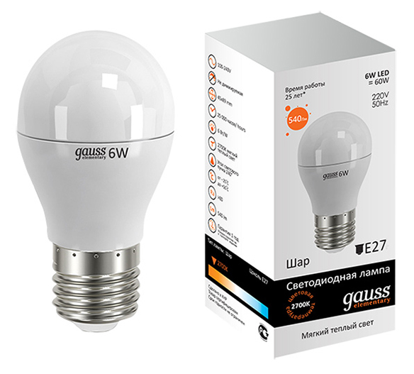 Купить "Лампа светодиодная E27 6W 2700K шар матовый 53216"