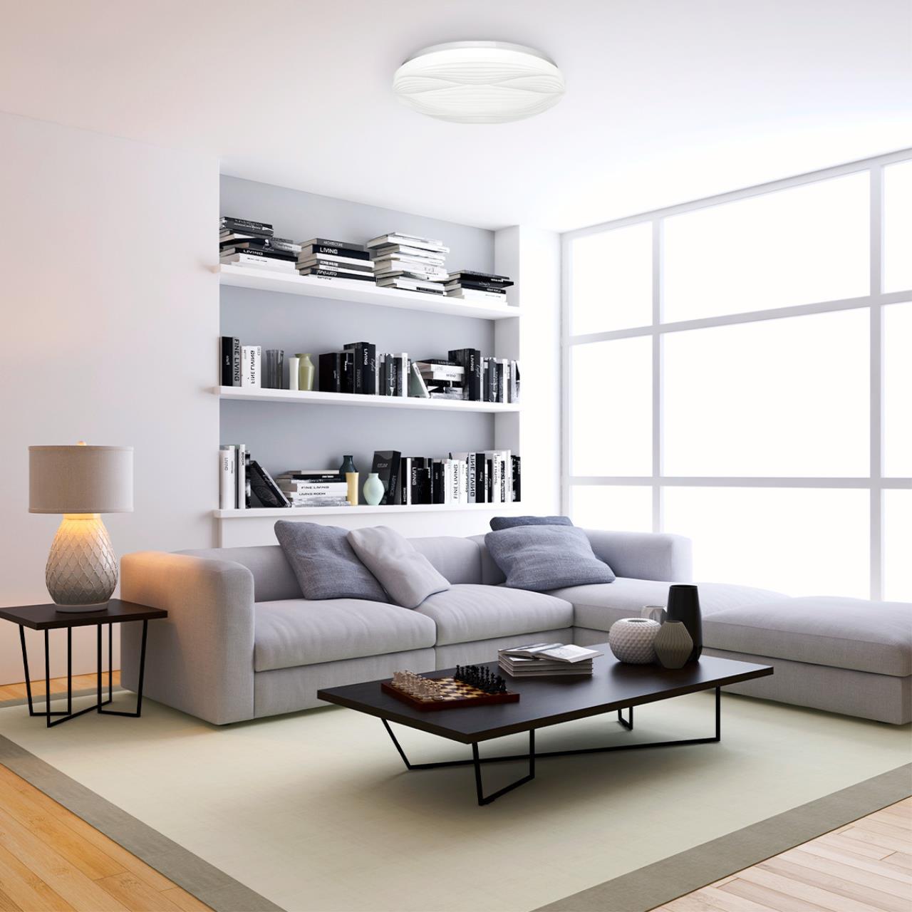 Светильник 7686/DLN линии HIMAR состоит из металлического основания (базы) и пластикового рассеивателя. Материал рассеивателя — высококачественный пластик марки PMMA 2.0 белого цвета с матовой поверхностью. Пластик обеспечивает светильнику равномерное рассеивание и хорошее светопропускание. Форма плафона: круглая, декорирована рельефом из пластика в виде узора белого цвета. Степень защиты IP43 позволяет использовать светильник в определенных зонах влажных помещений. В комплект входит LED-модуль с линзами мощностью 48 Вт, соответствующей лампе накаливания 515 Вт, а также переключатель температуры цвета (ССT) на драйвере, с помощью которого осуществляется изменение цветовой температуры 3000/4000/6000 К и переход светильника в режим теплого/белого/холодного света. Для установки необходимого режима рекомендуется использовать удлиненный тонкий предмет типа небольшой отвертки.