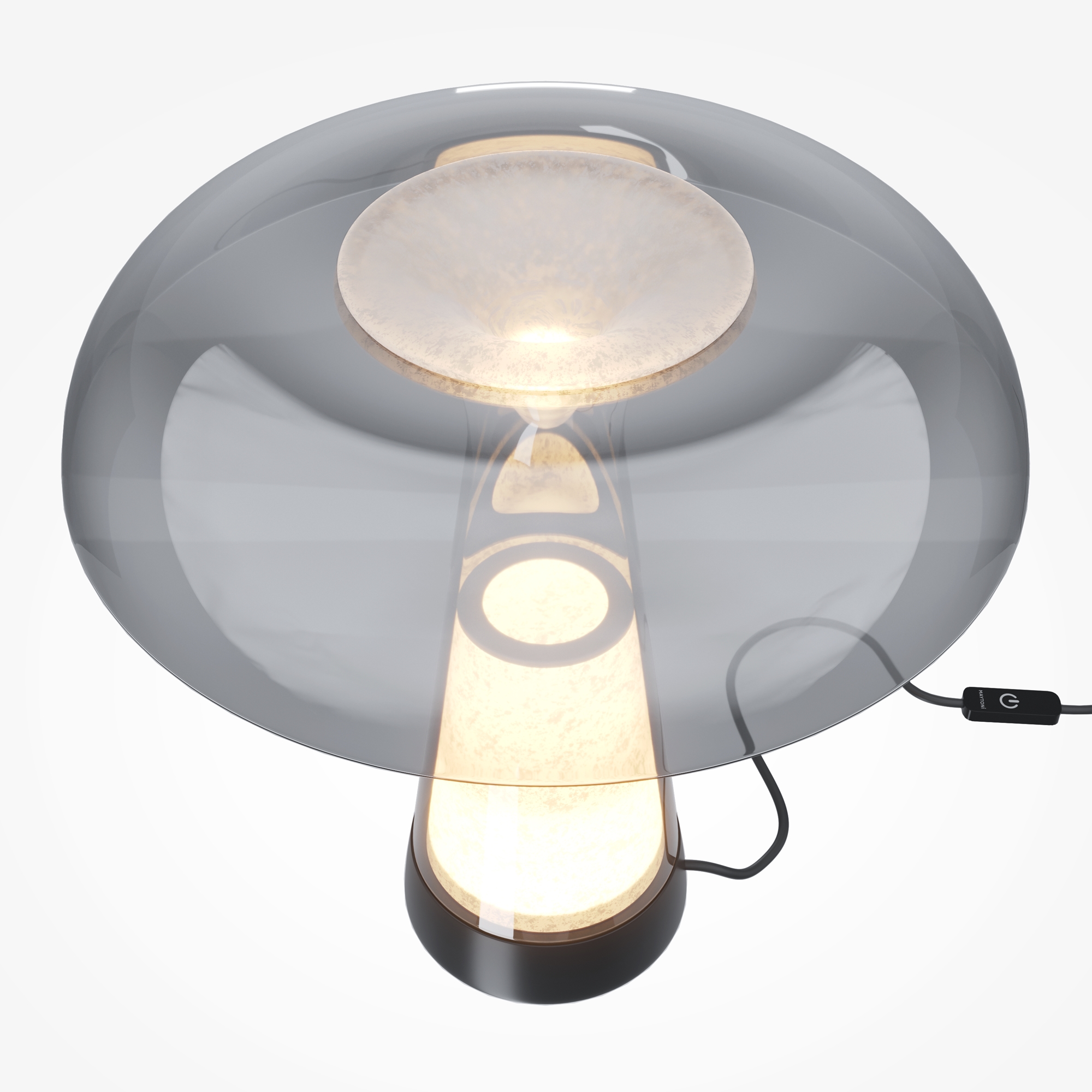 Дизайн представляет собой метафору музейного экспоната. Основной элемент — натуральный белый алебастр, скрытый за тонированным дымчатым стеклом с зеркальным эффектом. Свет LED-источника с переключателем температуры 2700-3000-4000К подчеркивает природную текстуру камня. Основание из черного металла. Управление осуществляется через сенсорный выключатель на проводе с функцией диммирования. При размещении у стены создает оптические эффекты (каустику). Античная эстетика, арт-объект в интерьере.