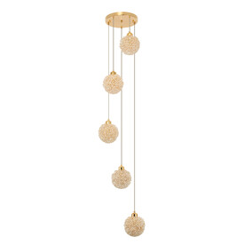 Каркас люстры — металлический, роскошного золотистого цвета. Силуэт составлен из множества тонких золотых колечек, внутри каждого из них закреплен кристаллик из прозрачного хрусталя. Тонкие подвесные тросы практически незаметны, создавая ощущение, что светильник парит в воздухе.