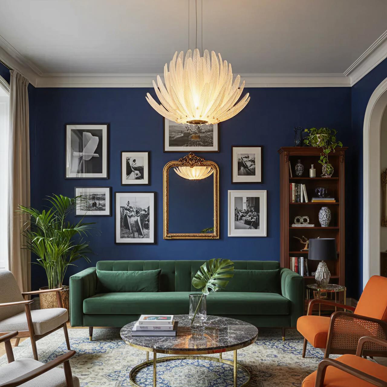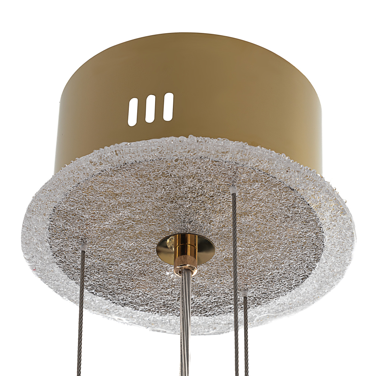 Люстру можно смонтировать даже на натяжной потолок, а также установить в комнате с невысокими потолками, поскольку высота подвесов регулируется.