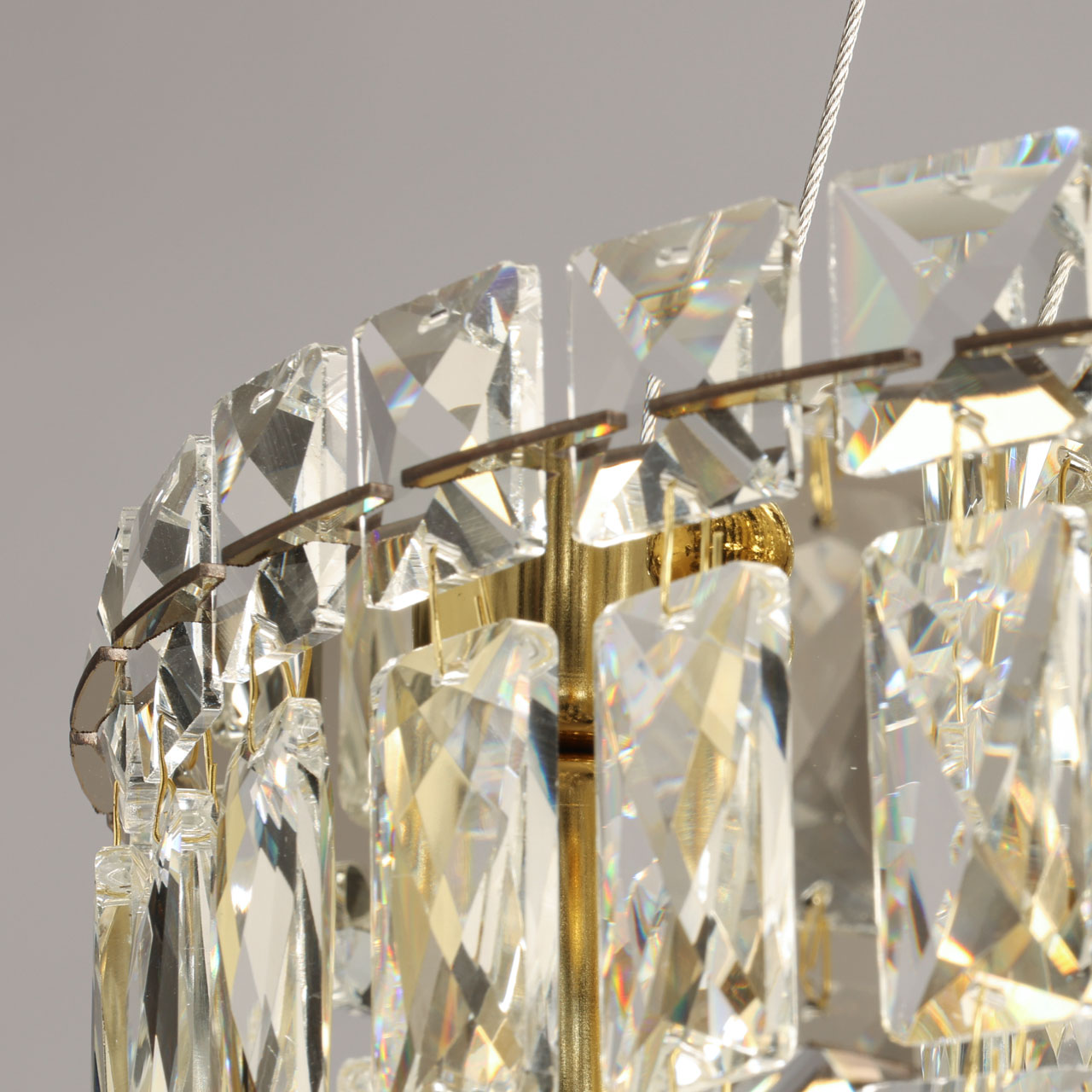 Металлическое основание люстры гальванизировано в цвет золота. Светильник декорирован прозрачным хрусталем прямоугольной и квадратной формы.