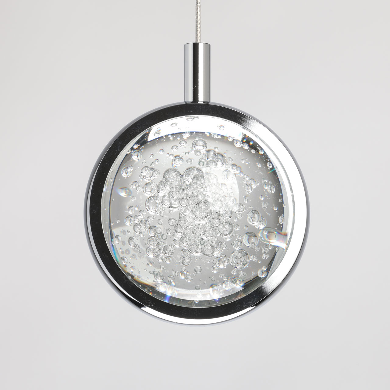 Основание светильника выполнено из сплава алюминия с цинком, обработано по технологии брашинга и гальванизировано в цвет хрома. Светодиодный источник света закрыт сферой из стекла с включениями пузырьков.