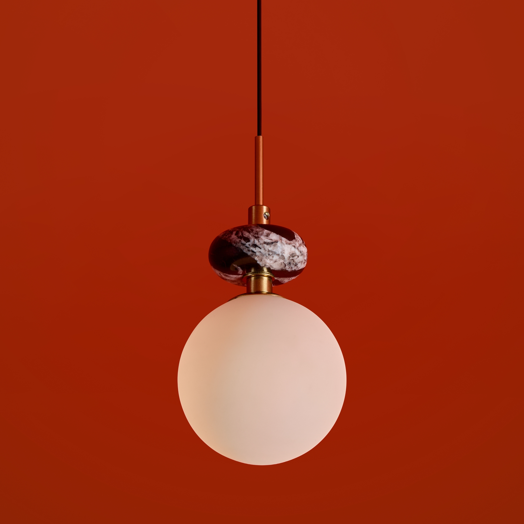 Арматура — металл. Плафоны из алебастра/камня и матового белого стекла. Версии с лампами G9 (не в комплекте) и с LED источником света. Высота регулируется.