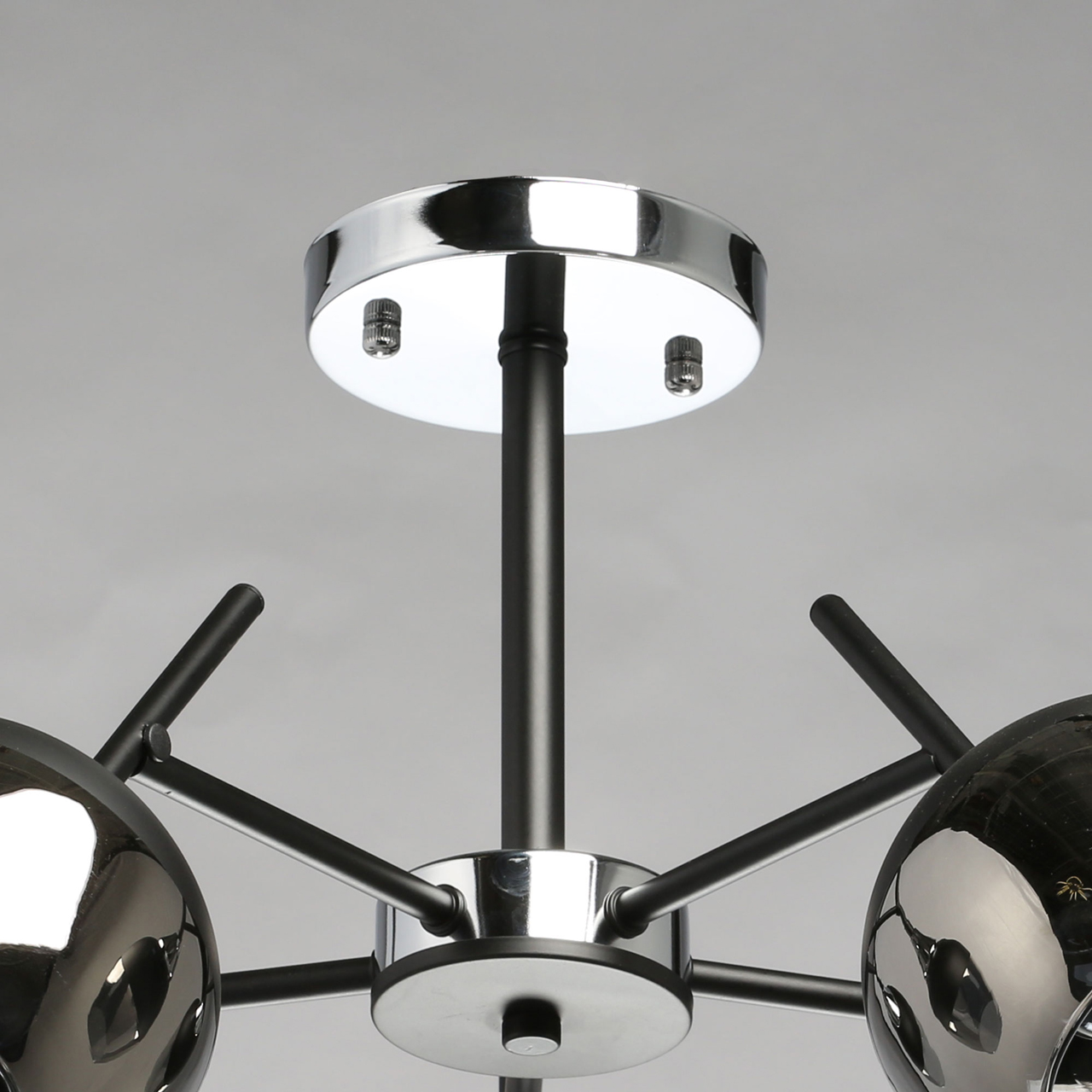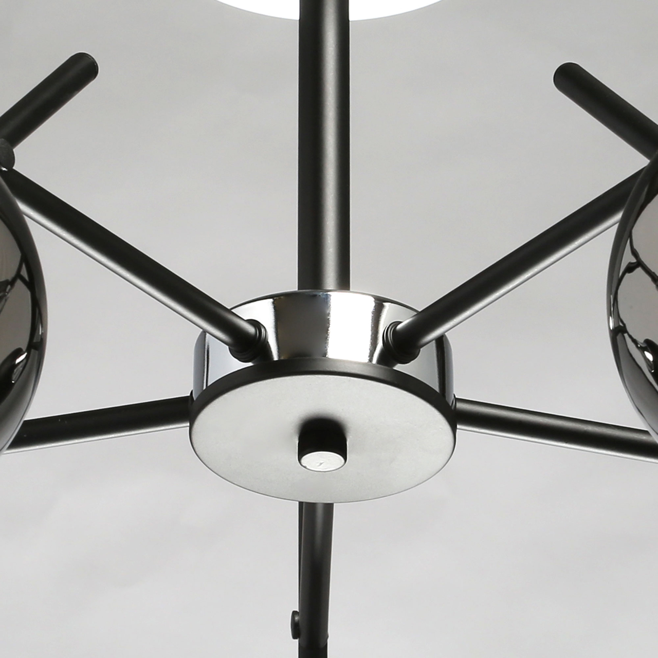 Основание светильника выполнено из металла и окрашено в черный цвет. Отдельные элементы основания гальванизированы в цвет хрома. Стеклянные плафоны гальванизированы в дымчатый цвет и окрашены в черный цвет у основания.