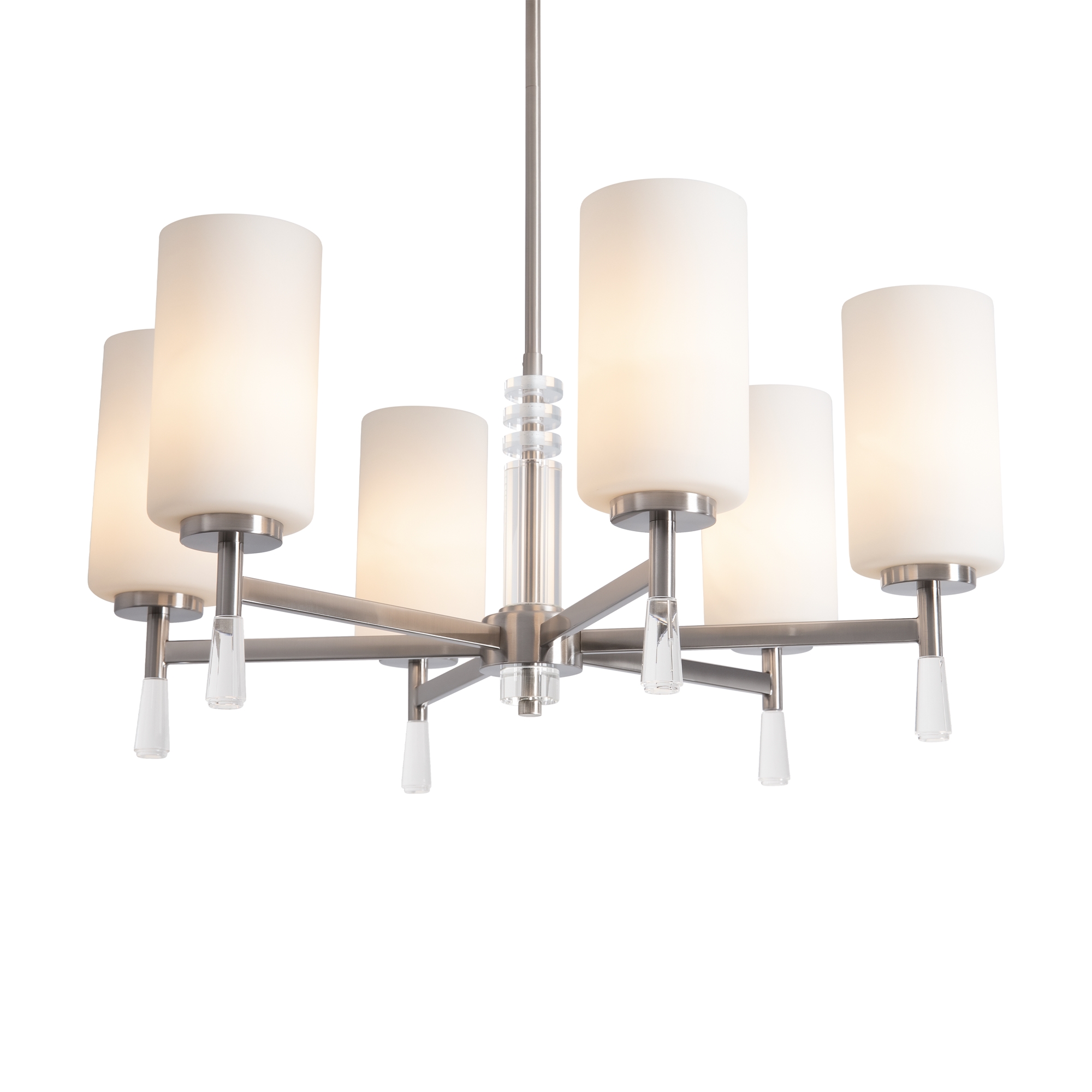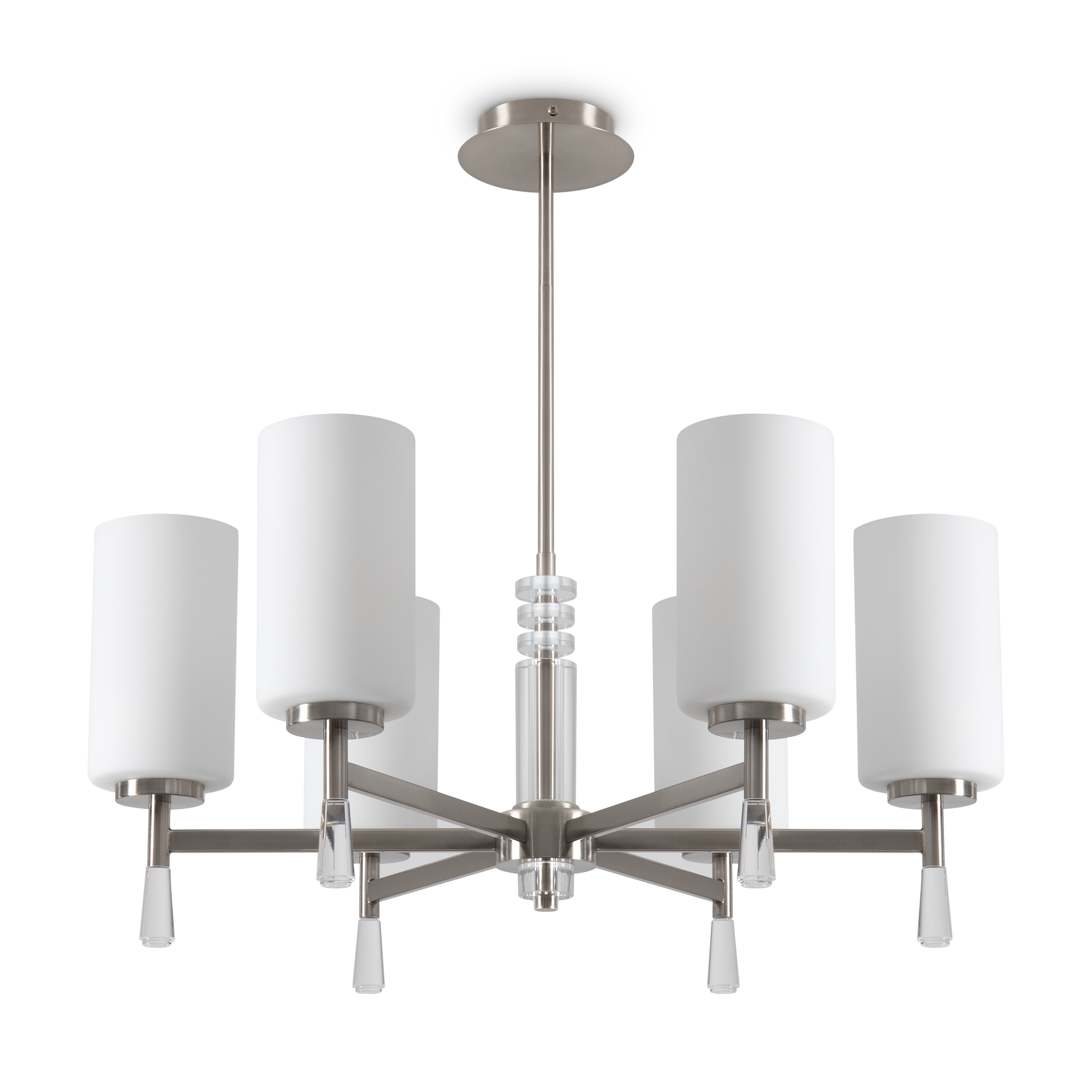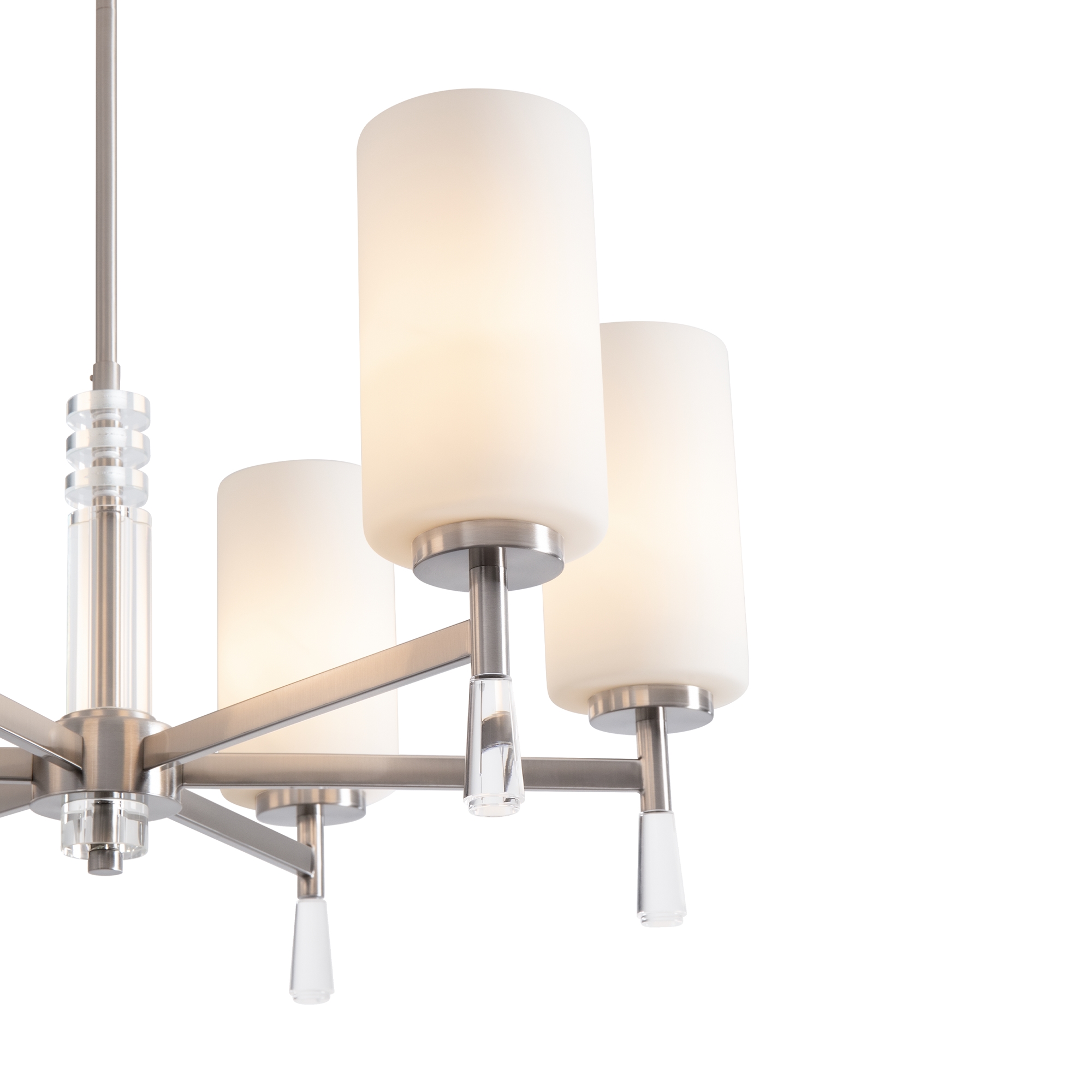Металлическая арматура: латунь или никель (новинка серии).Белые стеклянные плафоны цилиндрической формы, направленные вверх.. Хрустальное основание с акриловыми каплями. Лампа E27.