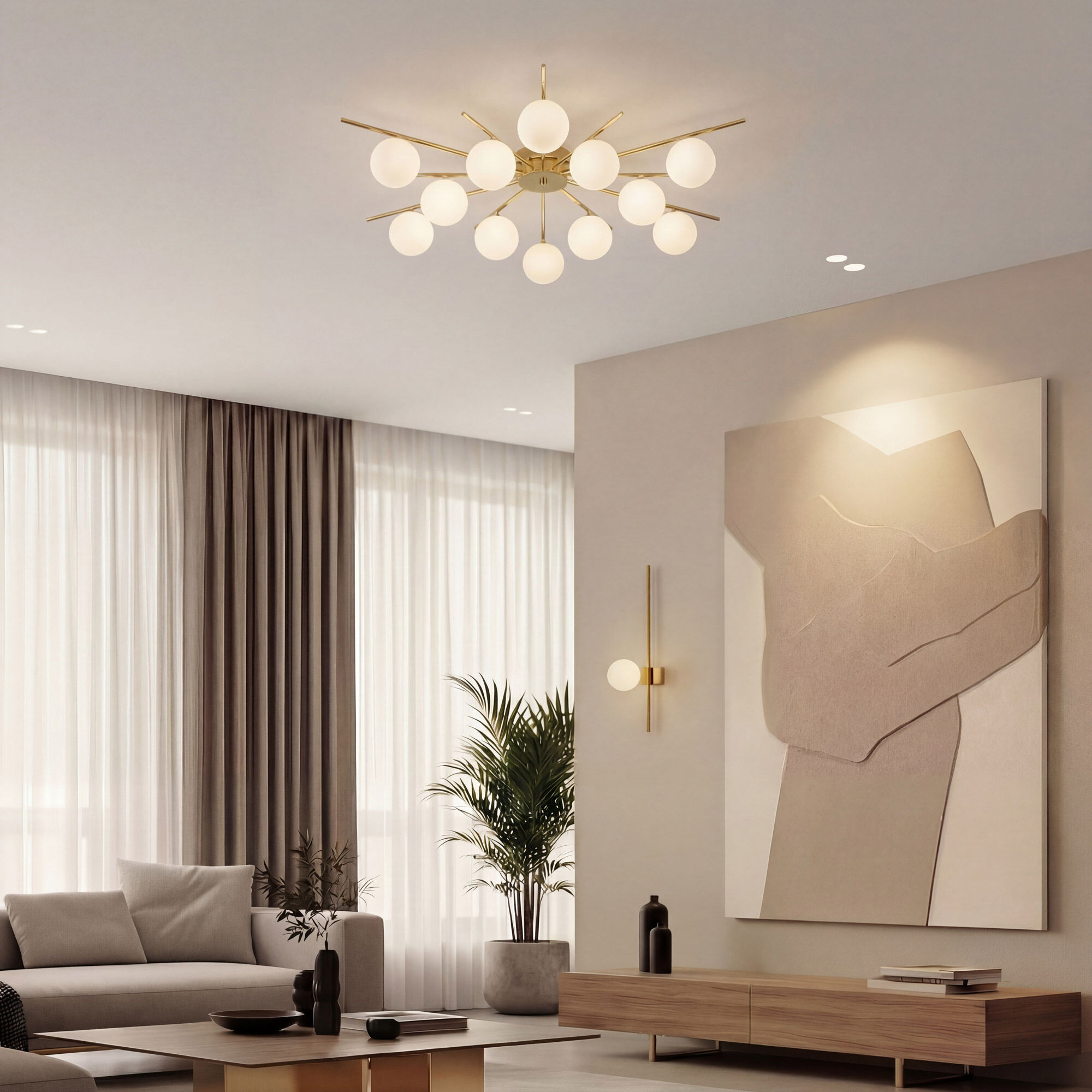 Умная потолочная люстра из коллекции Sabina - это изысканный элемент декора, способный преобразить любое пространство, добавив нотку утончённости. Люстра украшена матовыми плафонами изготовленными из жаропрочного стекла, мягко распределяющими свет по всему помещению.