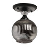 Металлическое основание светильника окрашено в черный цвет. Стеклянный плафон отлит в сложную форму и гальванизирован в дымчатый цвет. У основания светильник декорирован прозрачным хрусталем.