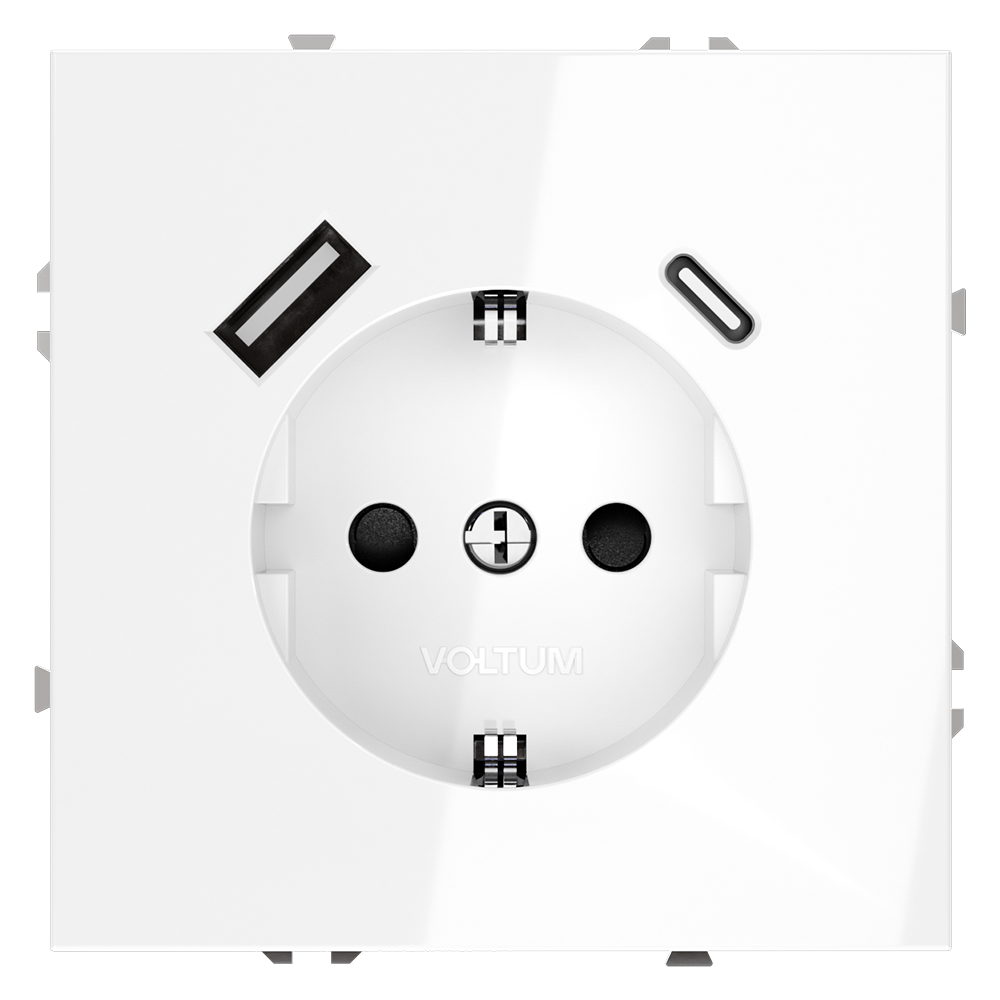 Купить "Розетка встраиваемая с заземлением и защитными шторками, 16А, с USB, A+С Voltum S70 VLS040501 (белый глянцевы"