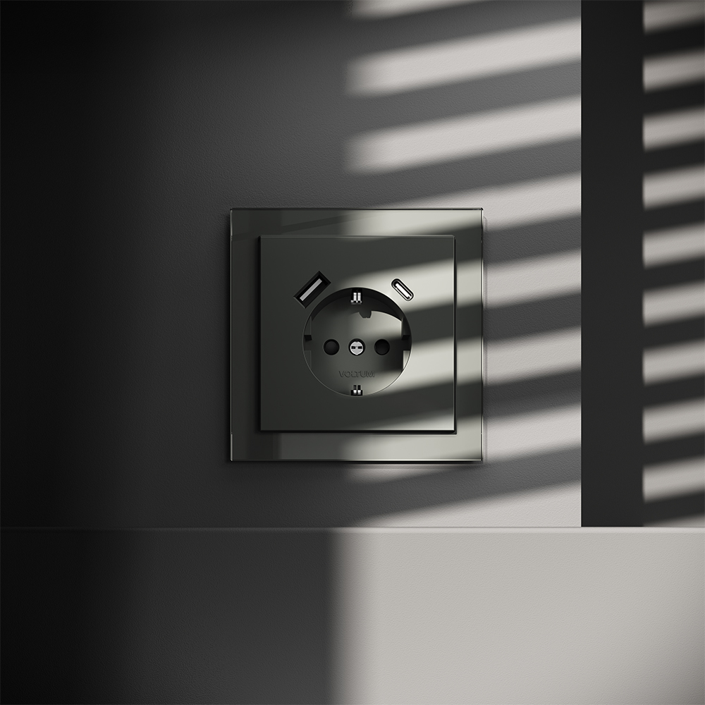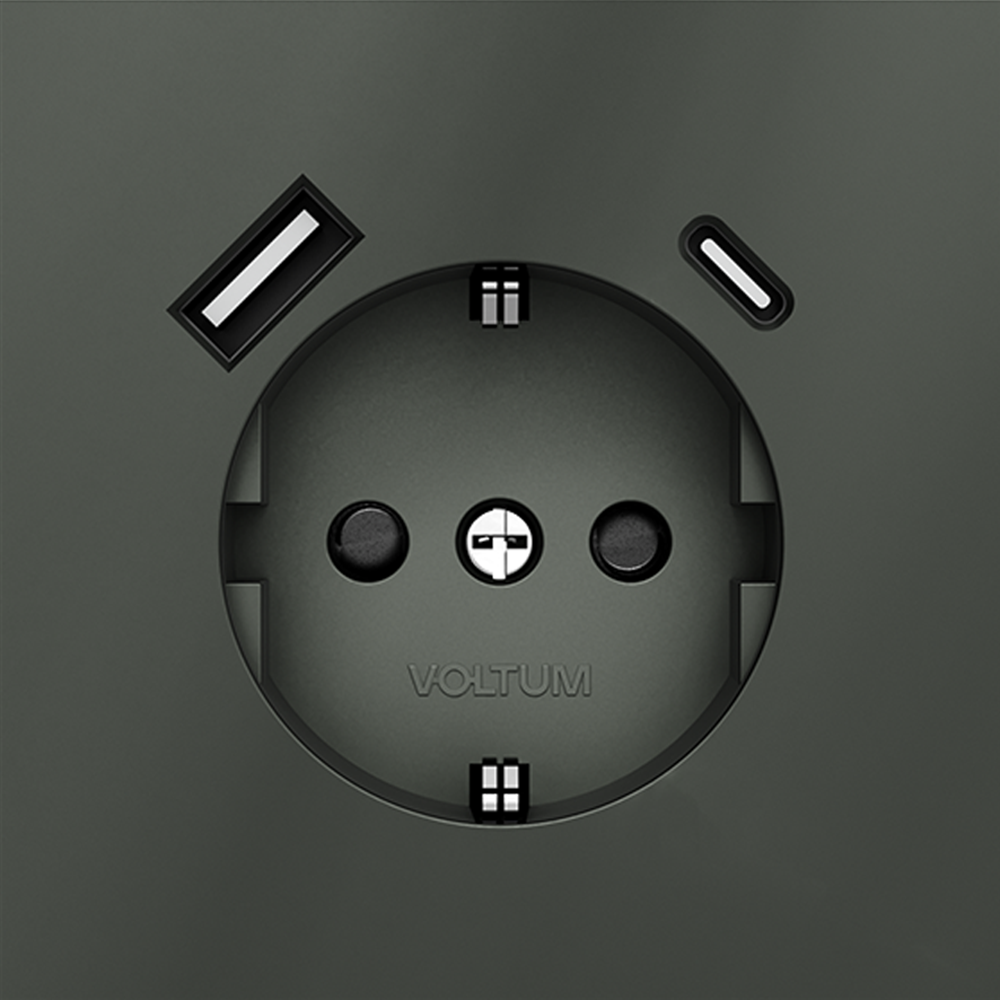 Купить "Розетка встраиваемая с заземлением и защитными шторками, 16А, с USB, A+С Voltum S70 VLS040506 (титан)"