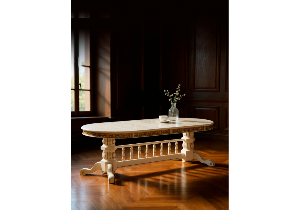 Материал каркаса - массив бука; Материал столешницы - Шпон; Ширина - 110; Высота - 77; Длина стола в разложенном виде - 330; Длина - 260;