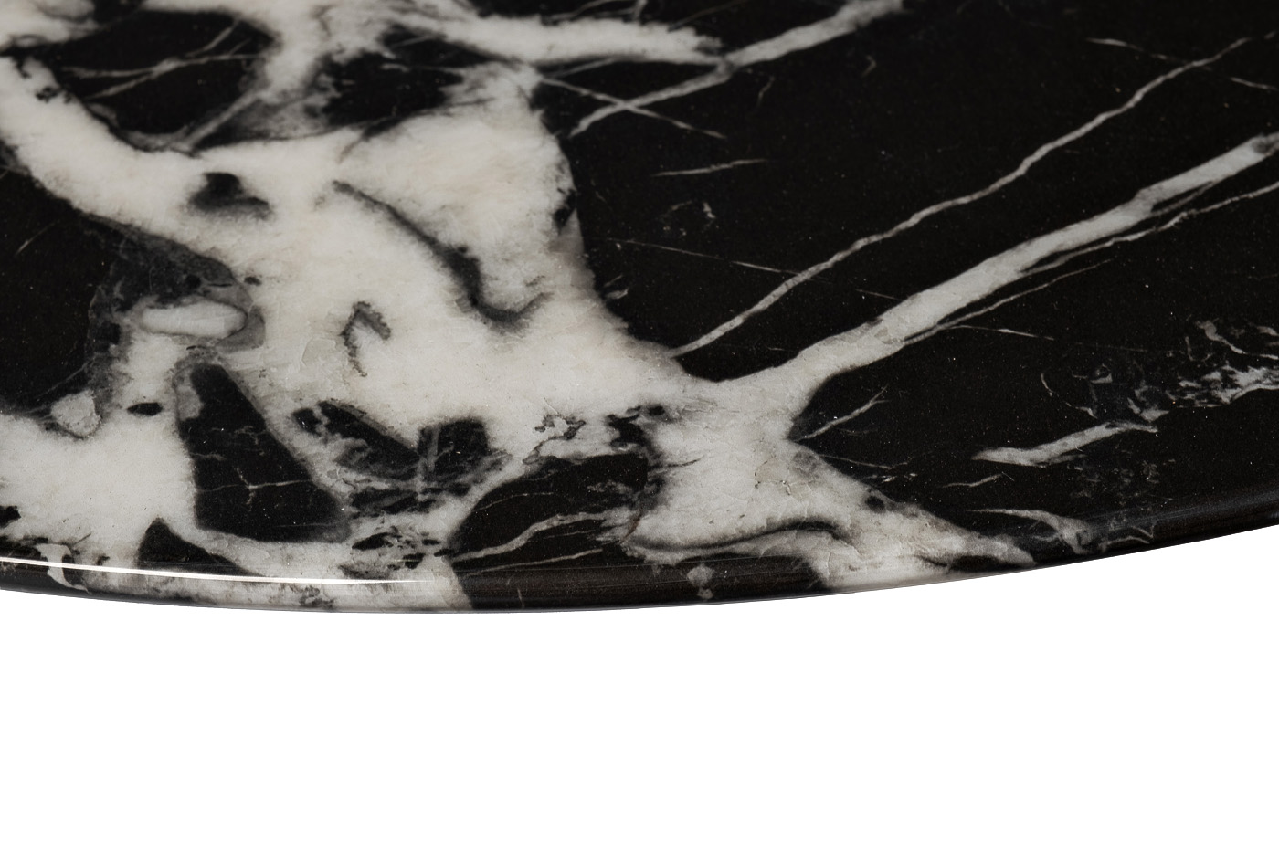 Роскошный журнальный стол с круглой столешницей из натурального мрамора с полимерным покрытием станет доминантой просторной гостиной или холла в стиле ар-деко. Столешница выполнена из натурального камня черного цвета с белыми прожилками. Уникальный природный рисунок мрамора, неповторимый в каждом изделии, делает этот журнальный стол похожим на произведение искусства. Опоры стола, выполненные из нержавеющей стали цвета бежевый металлик, выглядят легко и изящно. Эта модель стола исполнена из искусственного черно-белого мрамора (камень с полимерным покрытием). Основание из гнутых листов нерж.стали цвета бежевый металлик.