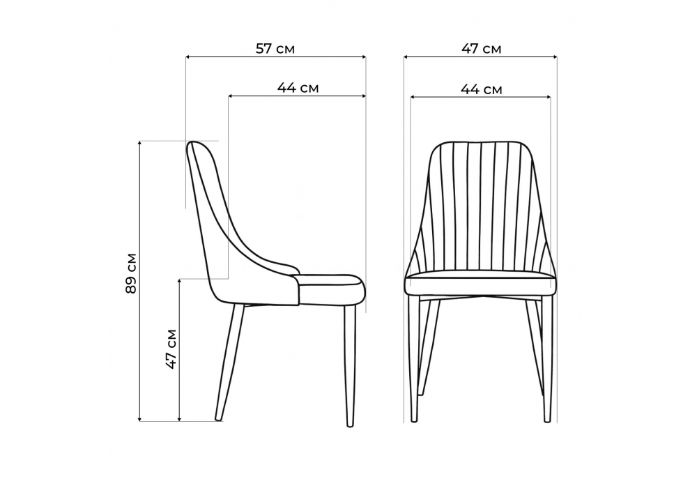 Материал каркаса - металл; Материал сиденья - велюр; Материал обивки - велюр; Цвет ножек - черный; Ширина - 47; Глубина - 57; Высота - 89; Ширина сиденья - 44; Глубина сиденья - 44; Высота сиденья - 47;