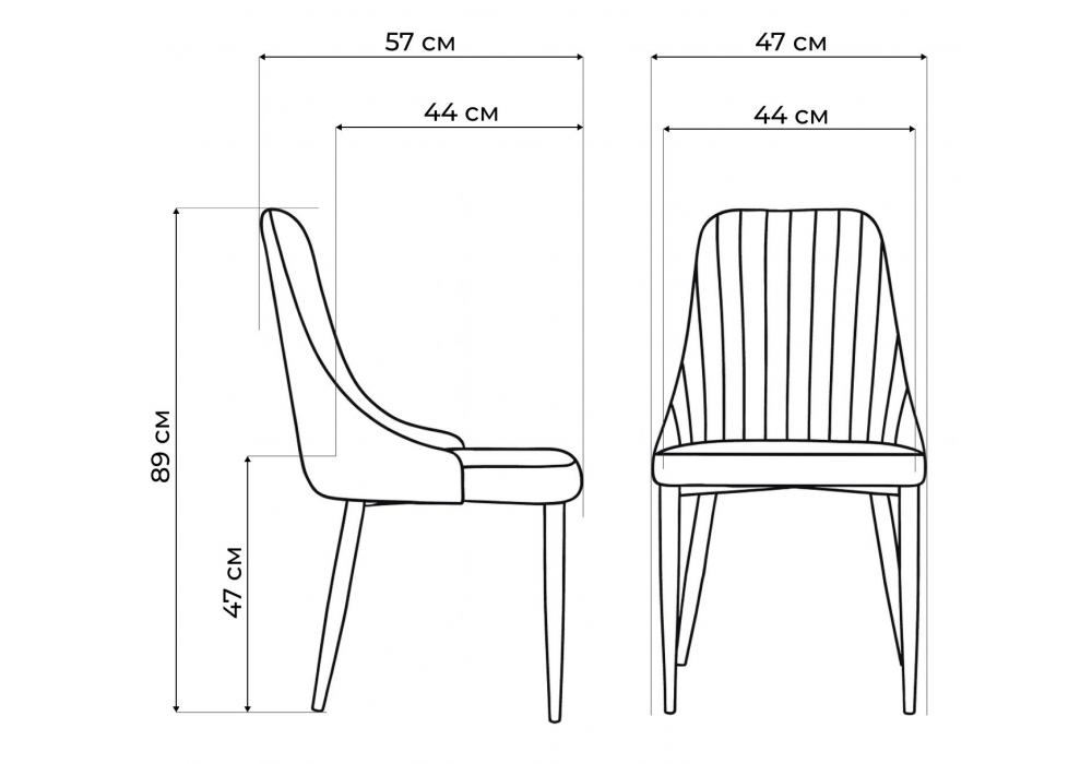 Материал каркаса - металл; Материал сиденья - велюр; Материал обивки - велюр; Цвет ножек - белый; Ширина - 47; Глубина - 57; Высота - 89; Ширина сиденья - 44; Глубина сиденья - 44; Высота сиденья - 47;