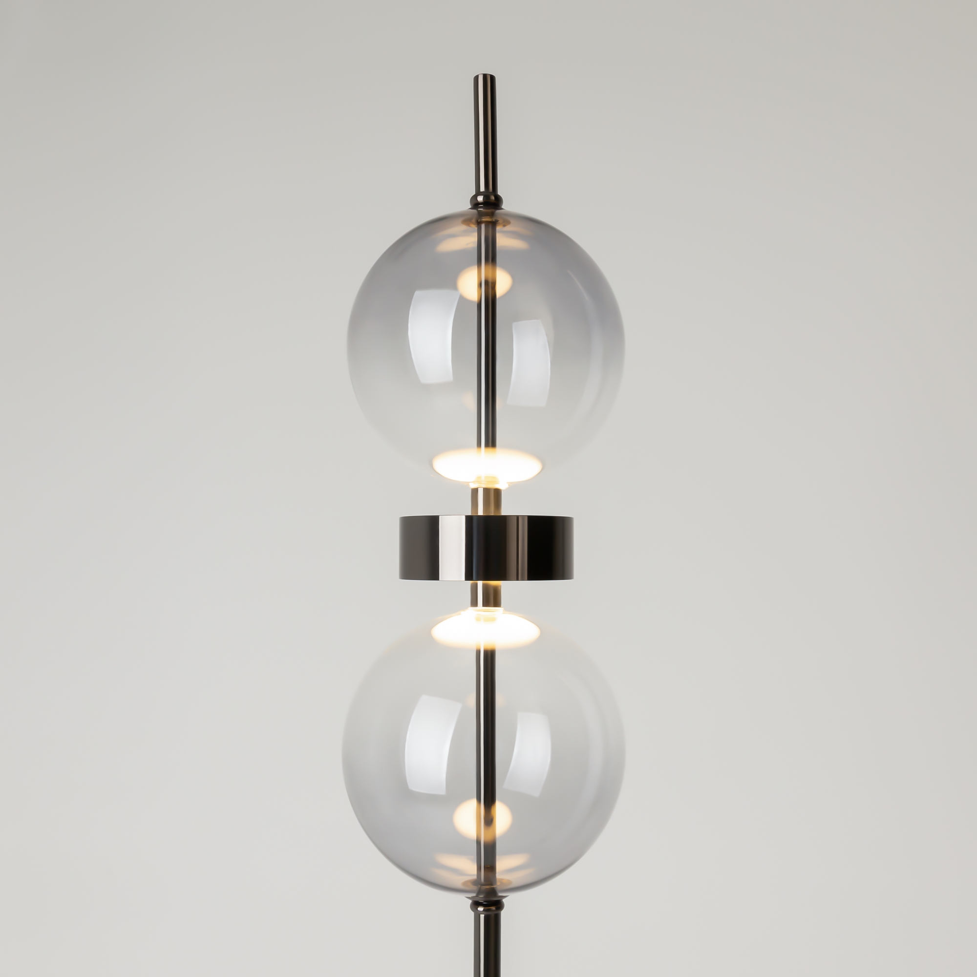 Серия включает подвесной светильник, бра, напольный и портативную модели. Стеклянные плафоны с зеркальным градиентом, черная глянцевая арматура из металла. LED-источник (3000K) скрыт матовым рассеивателем. Конструктивные особенности: магнитные потолочные чаши у подвесов и магнитное основание у бра обеспечивают монтаж без видимого крепежа. Напольный и аккумуляторный светильники диммируются при длительном удержании кнопки. Серия отмечена премиями Red Dot и A’design за инновационный дизайн.
