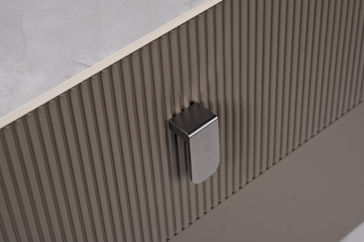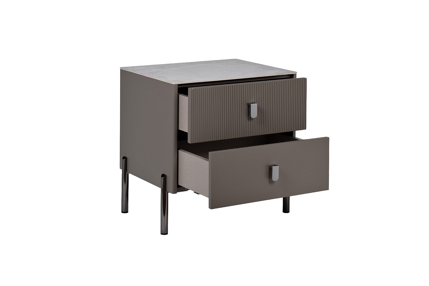 Стильная и лаконичная тумбочка в сером цвете красиво дополнит интерьер спальни, гардеробной или гостиной. Дизайн предмета мебели отличается сдержанностью. Глубокий серый цвет придает изделию благородства, а тонкие ножки позволяют экономить место в помещении. Особенностью этой модели является наличие двух выдвижных ящиков, один из которых имеет абсолютно гладкий фасад, а другой выполнен с эффектом «гофре». Оригинальные металлические ручки дополняют современный стиль тумбочки и позволяют удобно открывать ящики.
